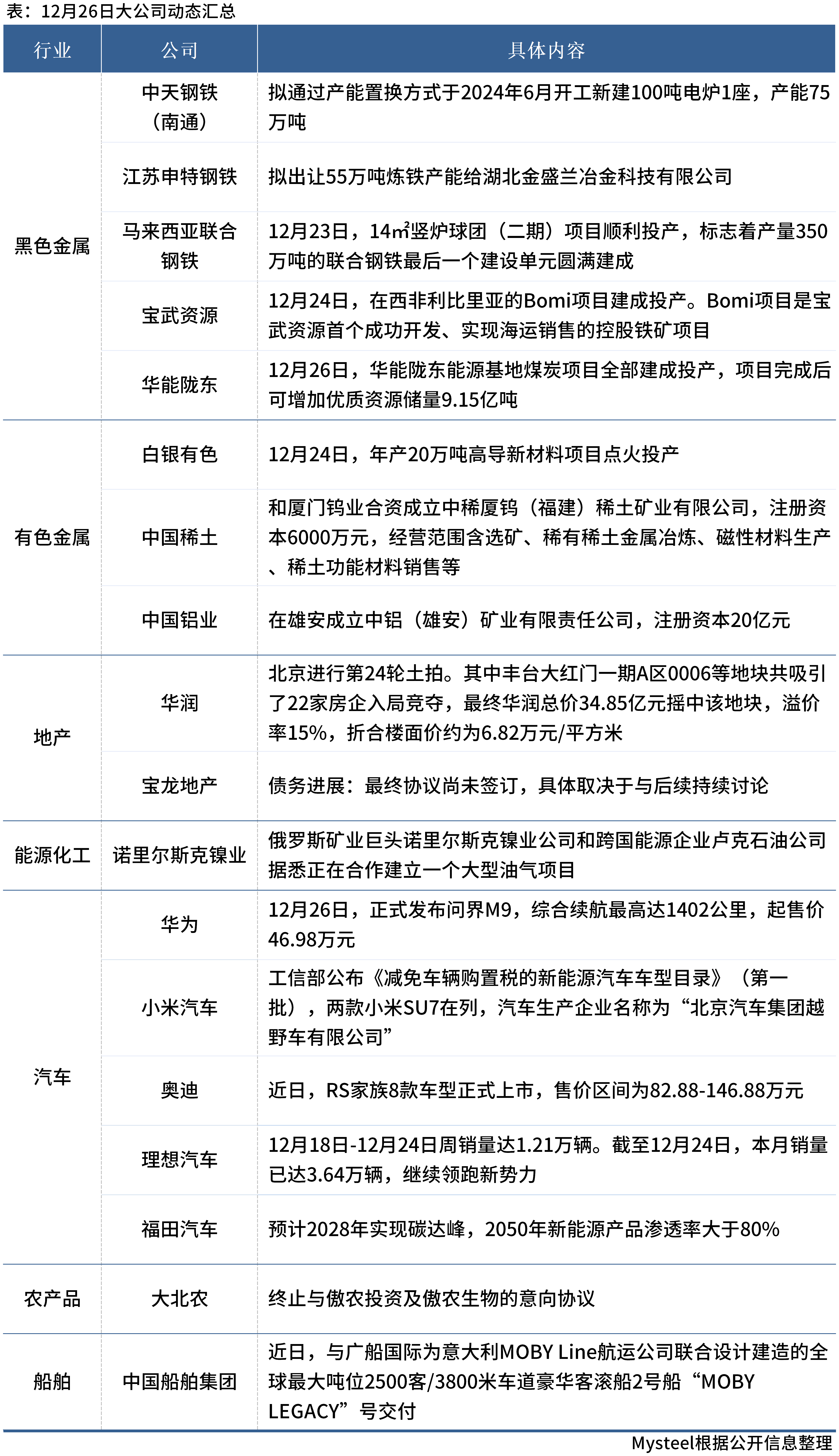 12月27日,Mysteel匯總部分大宗商品相關(guān)企業(yè)動(dòng)態(tài)。