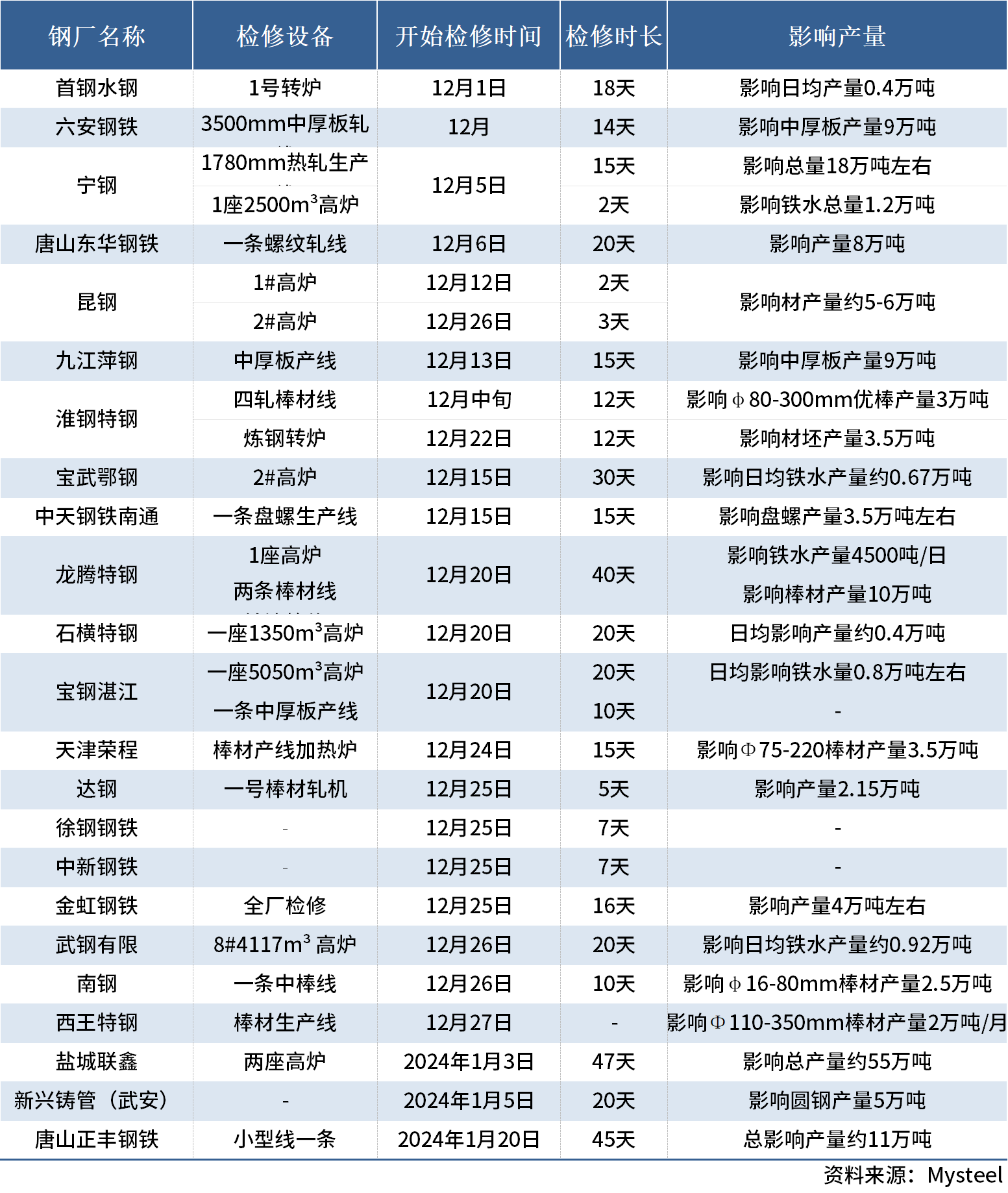 據Mysteel不完全統計,截至12月27日,國內23家鋼廠發布檢修信息。其中,金虹鋼鐵計劃于2023年12月25日-2024年1月9日起全廠檢修,為期16天,預計影響產量4萬噸左右。