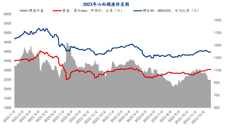 需求方面,2023年山西區(qū)域鋼廠多數(shù)時(shí)期處于虧損狀態(tài),廢鋼需求不佳,從螺廢價(jià)差來看,山西市場(chǎng)螺廢價(jià)差全年處于低位,整體低于去年,三四季度,在鋼材價(jià)格上行的帶動(dòng)下,螺廢價(jià)差穩(wěn)步上行,鋼廠利潤(rùn)好轉(zhuǎn),同時(shí)疊加鋼廠冬季累庫(kù)需求,四季度山西區(qū)域廢鋼需求達(dá)到年內(nèi)高位。